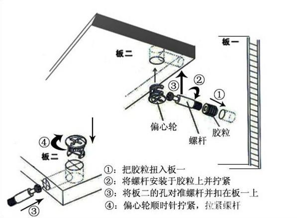 1、將三合一的膠粒如①抽屜孔內(nèi); 2、將②、③側(cè)板與抽面連接; 3、用中間固層¢3.5*40螺絲將④與②、③連接側(cè)板與合板; 4、將背板⑤插入②、③槽內(nèi),用小鐵釘固定在后板④上面,安裝內(nèi)嵌式拉手(拉屜要求方正,保持90°角度)。 四、安裝三節(jié)軌道:軌道頂住抽屜,平齊抽屜地板部,移動(dòng)母軌固定子軌螺絲裝于子軌豎眼上,(此為可調(diào)位)。兩處抽屜面板到軌道眼中央位的間隔再加2mm的間隙,拆下母軌按量出的數(shù)據(jù)在柜體側(cè)板上用90°角尺畫橫切線,此橫截線為母軌的中央眼線。抽屜面板為入柱,所以再從柜體側(cè)板外邊內(nèi)進(jìn)19mm畫出豎切線,母軌平齊豎切線,中央眼平齊橫切線,螺絲裝于母線的橫眼上(可調(diào)位)。抽屜裝上后利用可調(diào)位進(jìn)行調(diào)試,使抽屜面平,附近縫隙平均。最后裝固定螺絲在子軌的橫眼上、母軌的豎眼上。以此類推安裝下一個(gè)。如趕上滿抽屜,同樣的原理也可從下往上依次安裝,最上方抽屜固定可用90°角碼固定。條件要求抽面平整,見習(xí)平均抽屜間隙為2mm。 五、格子架:與裝抽屜三節(jié)軌一樣裝好三節(jié)軌道,量出側(cè)板到軌道中央位的間隔加50mm的間隙,得出數(shù)據(jù)在柜體側(cè)板上畫橫切線,安裝母軌,進(jìn)行調(diào)試、固定。格子架上側(cè)板里上方固定保持50MM間隙,目的為了利便取物。 六、褲子架:與格子架安裝相似,不同的是褲架側(cè)板離格子架面地步為20mm間隙。保持20mm的內(nèi)空也是為了利便使用。 七、推拉鏡的安裝:把三節(jié)軌道安裝到推拉鏡上,推拉鏡高度一般在底固層往上1700mm,(客戶可以要求高度)。在側(cè)板上按要求高度用90°角尺畫出軌道橫切線。量出上線三節(jié)軌道中新眼之間的平行間隔,得出精確數(shù)據(jù)在側(cè)板上用90°角尺畫出下軌道橫切線。安裝推拉上、下方母軌道,母軌道間隔背板5mm,裝上推拉鏡。 八、衣通的安裝:從地步固層下移38mm畫橫切線,側(cè)板分中畫豎切線,交叉墊為衣通托上方第一個(gè)眼的中央位。 |